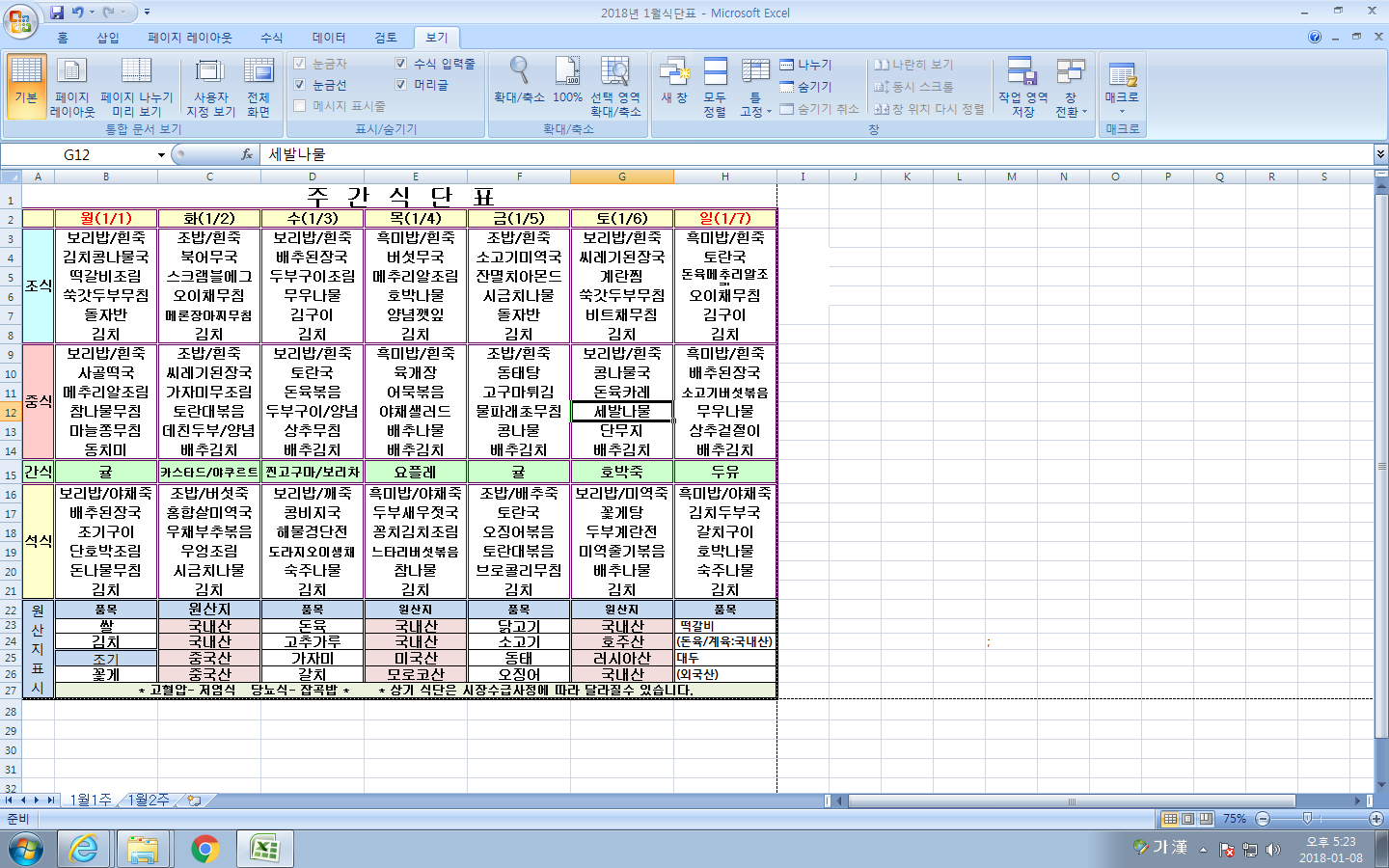 2018³â 1¿ù 1ÁÖ ½Ä´ÜÇ¥